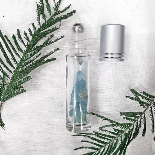 Your added essential oils are enhanced by aquamarine chips inside the bottle.